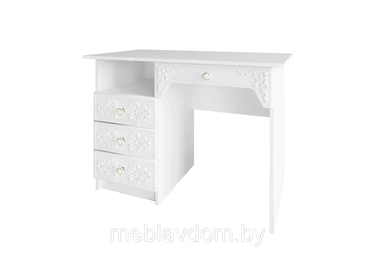 Письменный стол Ki-Ki станет идеальным решением для детской комнаты. Его изысканные фасады с тонкой резьбой придают интерьеру особую элегантность и создают атмосферу уюта и гармонии. Стол изготовлен из высококачественных материалов, что гарантирует его долговечность и надежность. Особенно выигрышно модель будет смотреться в сочетании с другими элементами из этой же коллекции мебели.